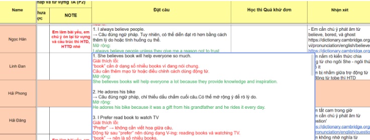 Sau mỗi buổi học sẽ có nhận xét chi tiết về phát âm, khả năng Nghe, chữa bài Viết chi tiết và BTVN là luyện Nói theo video.